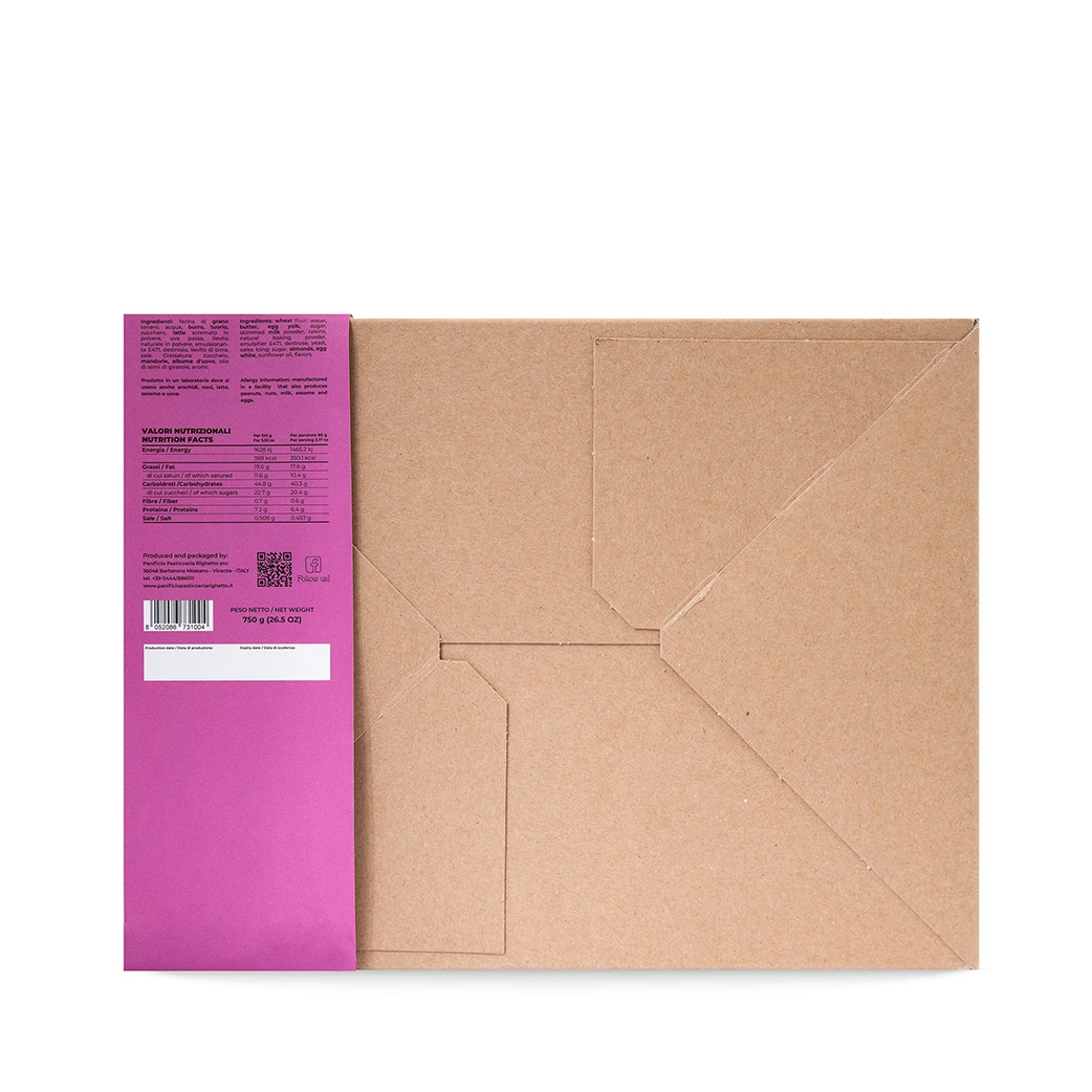 | Ingredienti | Acqua, Aromi, Burro, Destrosio, Emulsionante e471, Farina Tipo "0", Latte scremato in polvere, Lievito di birra, Lievito naturale in polvere, Mandorle, Nocciole, Sale, Uova, Uvetta, Zucchero |