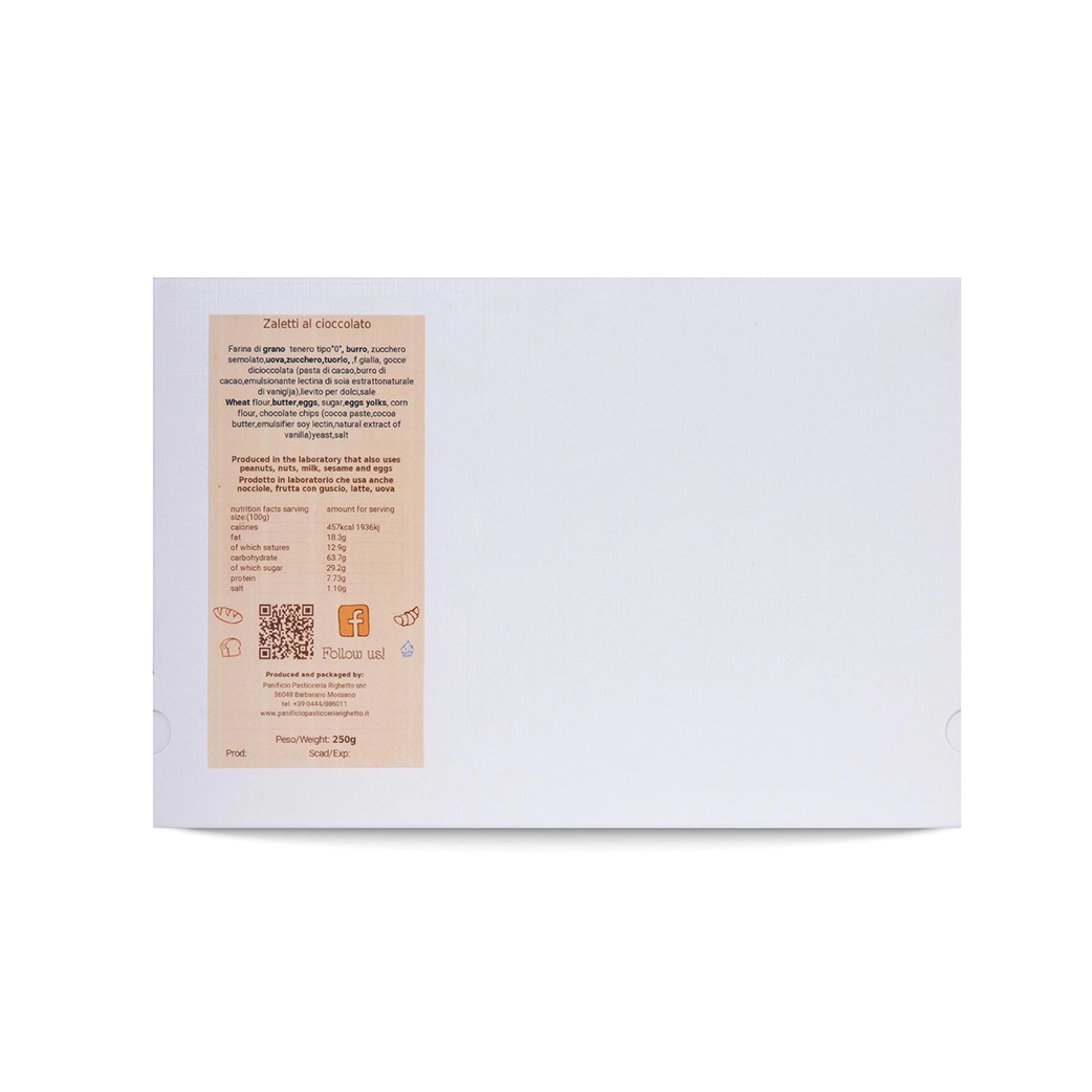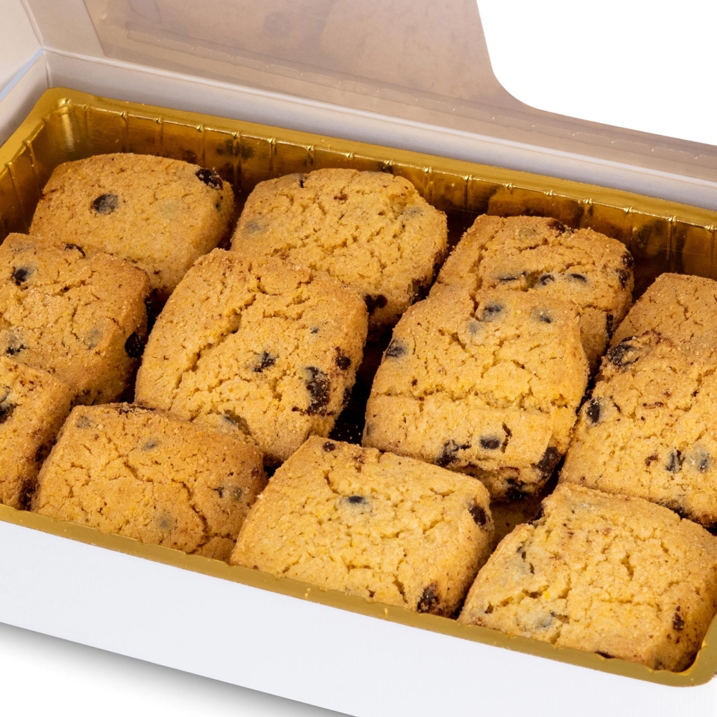 | Ingredienti | Farina di grano tenero tipo "0", burro, uova, zucchero, tuorlo d'uova, farina di mais, gocce di cioccolata (pasta di cacao, burro di cacao, emulsionante lecitina di soia, estratto naturale di vaniglia), lievito, sale |